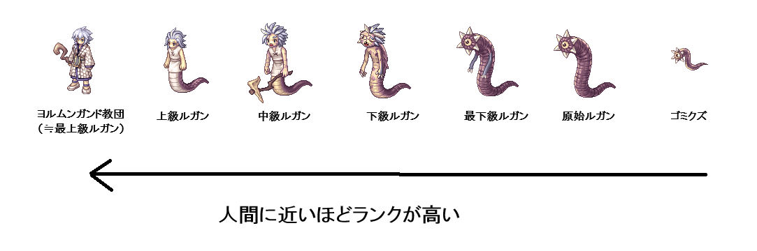 なんかのクエストで言ってたけど人間に近い方が高ランクって言ってたので、ヨルムンガンド○○~ 系はいわゆる最上級ルガンでいいよね('ω')