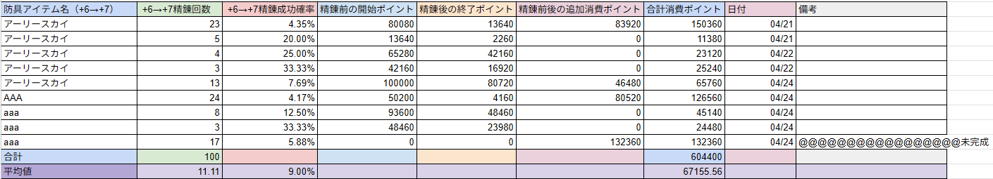 昨日のミラクルは347820Pで+7は4つでした回数を重ねていくと+7の成功確率が公表されている数値に収束されていくのがなんかわかりますね…(一部装備は相場に影響出ないように伏字)