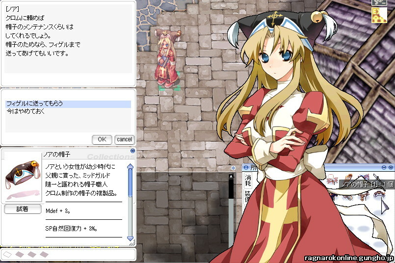 クエスト達成キャラが【ノアの帽子】を所持しているとゲフェンからフィゲルへ転送してもらえます。