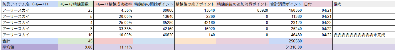初回でいきなり+7が出来たり+6を42回叩いてようやく+7が出来たりとやはりというか偏りがありますね…
