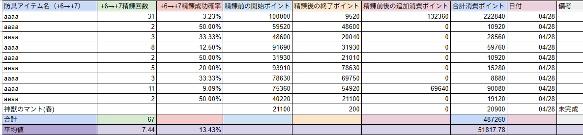 昨日のミラクルは354900Pで+7がなんと9つも成功するという私の精錬祭史上最高のスコアが出ました!+7成功確率13.43%とかなかなかの上振れですね