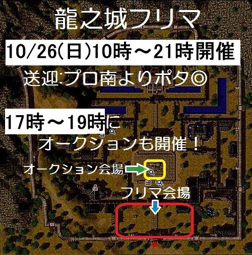 10時になりましたので、龍之城フリマ開催開始します!プロ南から無料送迎ポタも出てますので是非遊びに来てみて下さい!17時からオークションもありますのでお楽しみにです!#B鯖フリマ