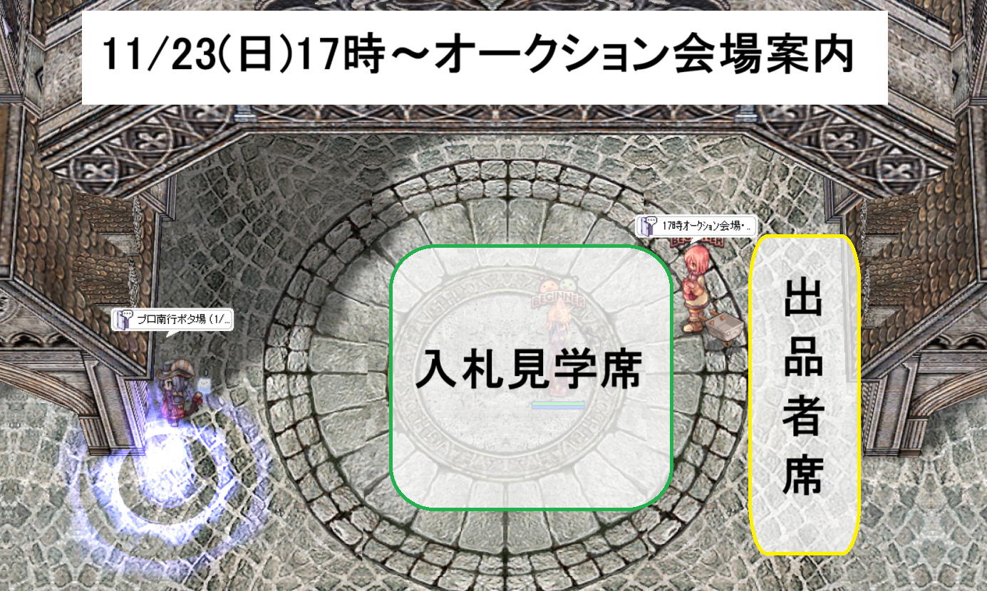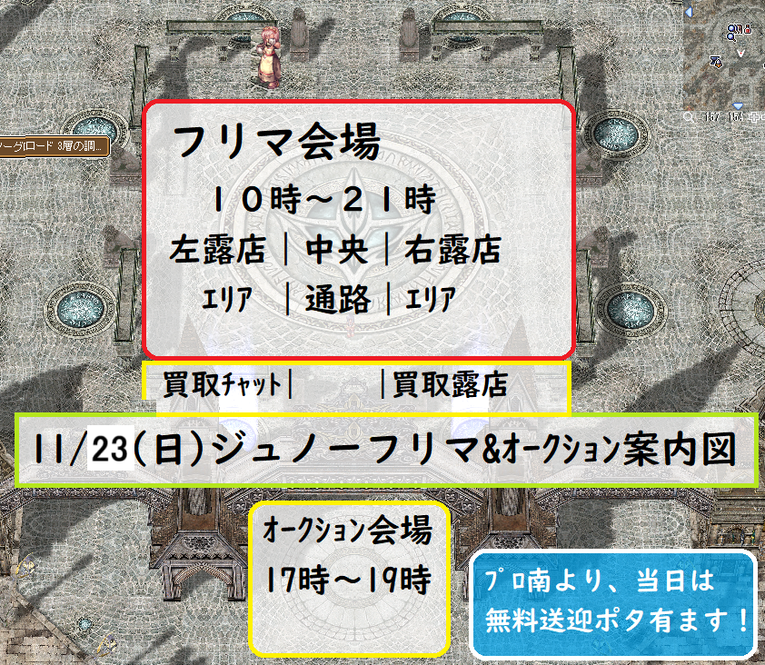 17時にジュノーでオークション開催です!フリマ側の中央通路から送迎ポタも出てますのでご利用下さい!