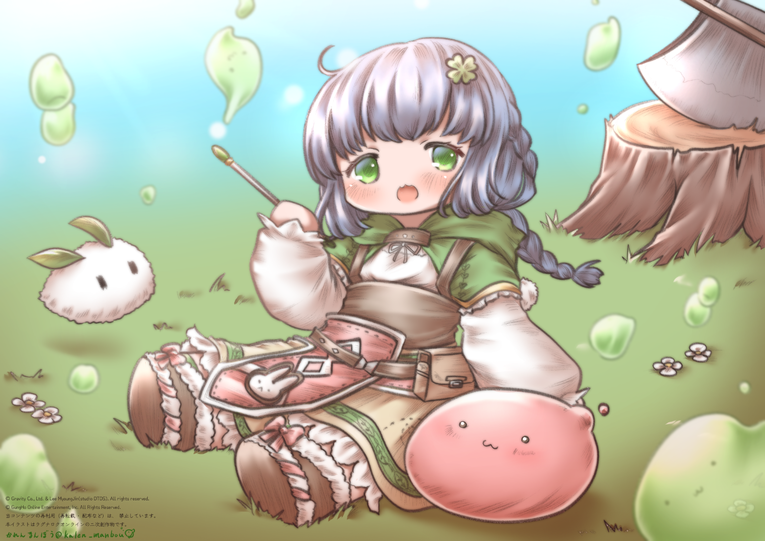 ドルイドの足を伸ばして座ってる姿が素朴でなんだか懐かしくてかわいいそして前掛けのうさちゃんがとってもとってもかわいい…!!#ro絵描き #roお絵かき