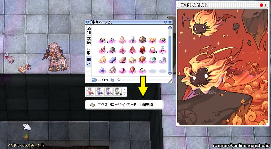 80回目に引き続きカード帖が落ち、開封したところエクスプロージョンcをドロー。ポリン族ではありませんでしたね。