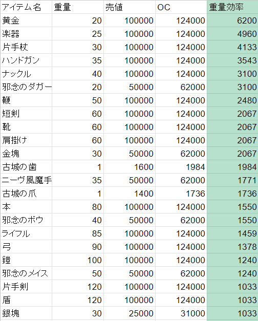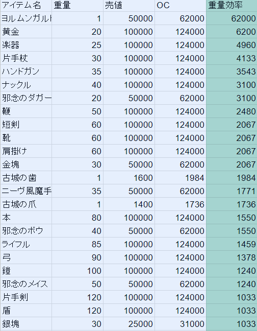 時間効率の話もあるので重量効率は参考値ですねあとヨルムンガルドの花入れ忘れた