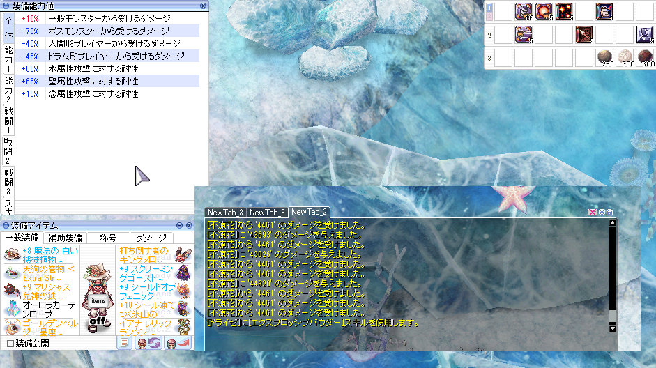 オーロラカーテンローブの聖50+盾セイクレッドで平原のほうの不凍花のレイジェネは約3万ダメージ。マップ6割耐性がある「凍て付いた鱗の氷河」のほうなら初心者でも十分な耐久が得られると思う。問題はそんなところで狩りをしても特に何の実入りもないところ。