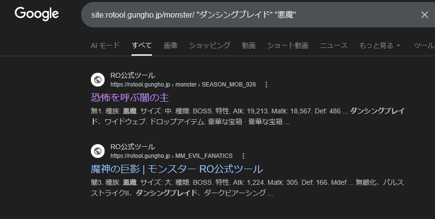 Googleの検索欄にsite:rotool.gungho.jp/monster/を入力し後にスキル名などを入れるとモンスターの絞り込みが楽に行えます