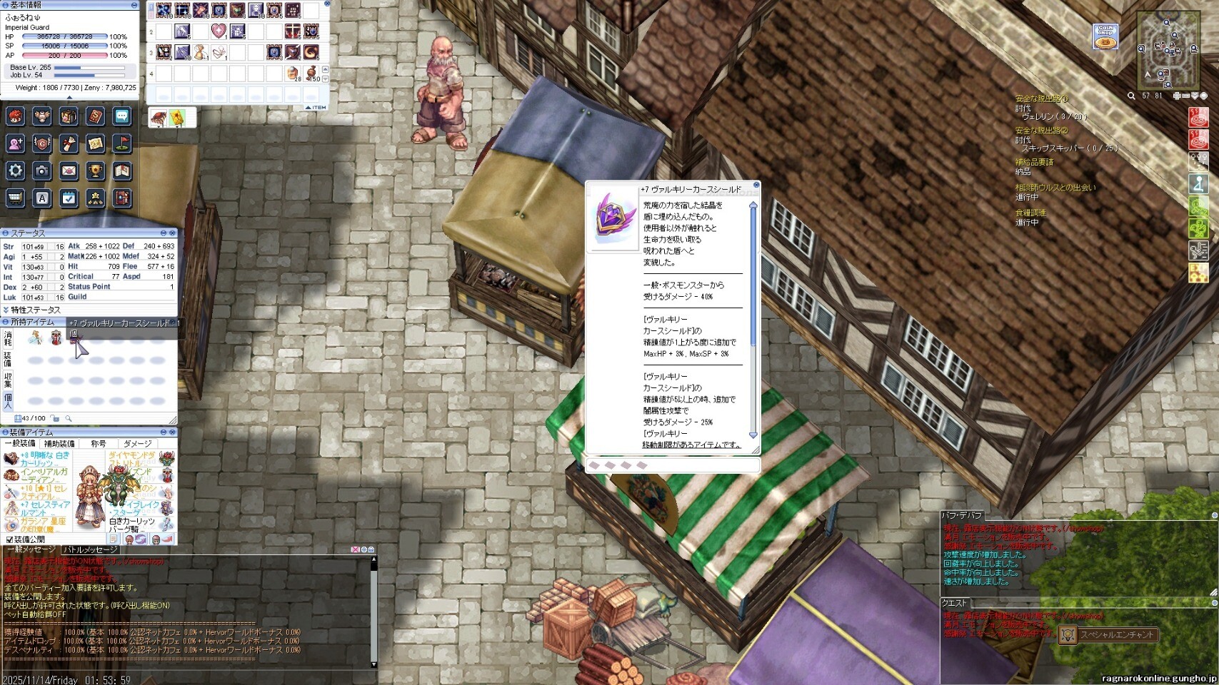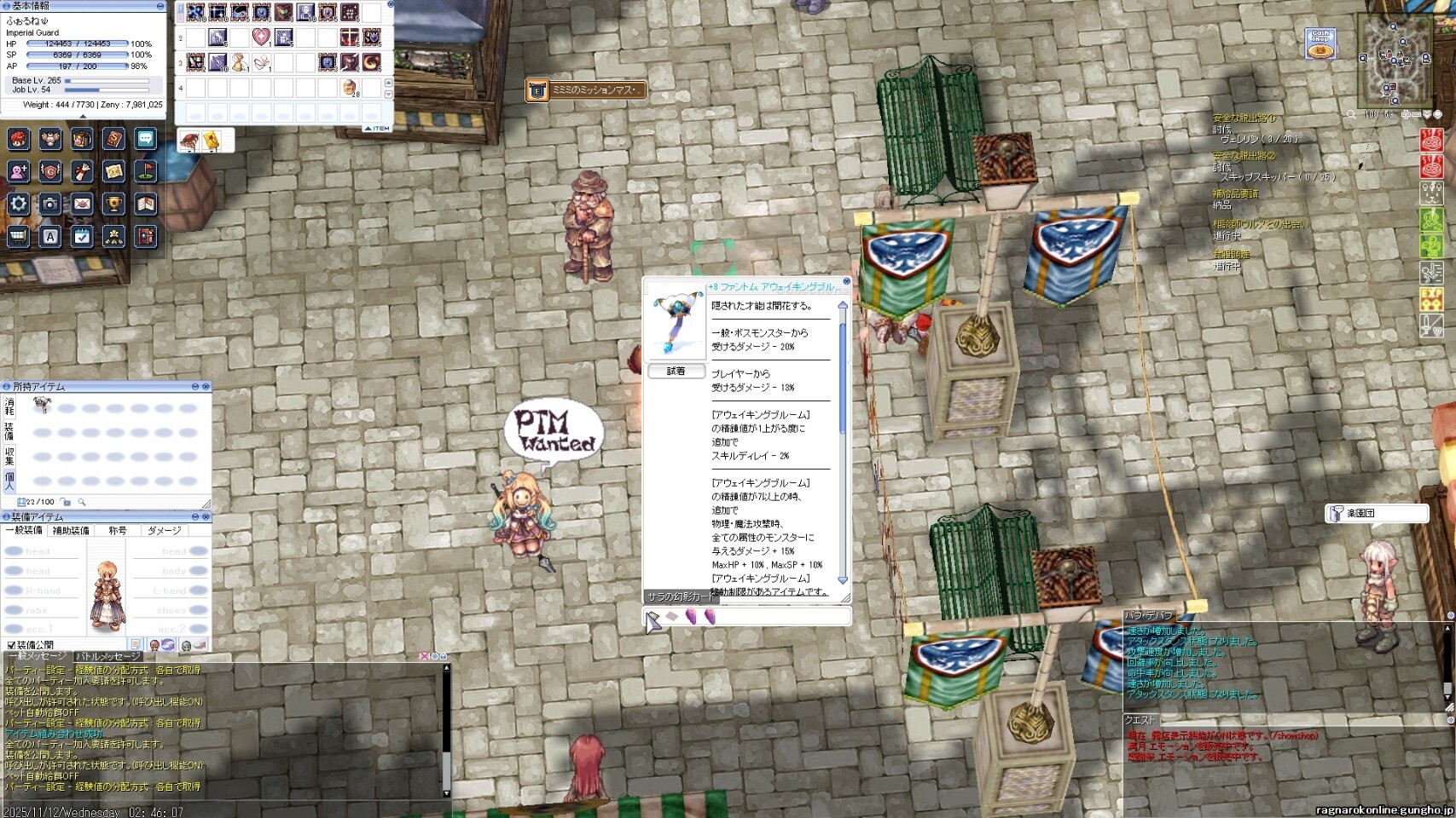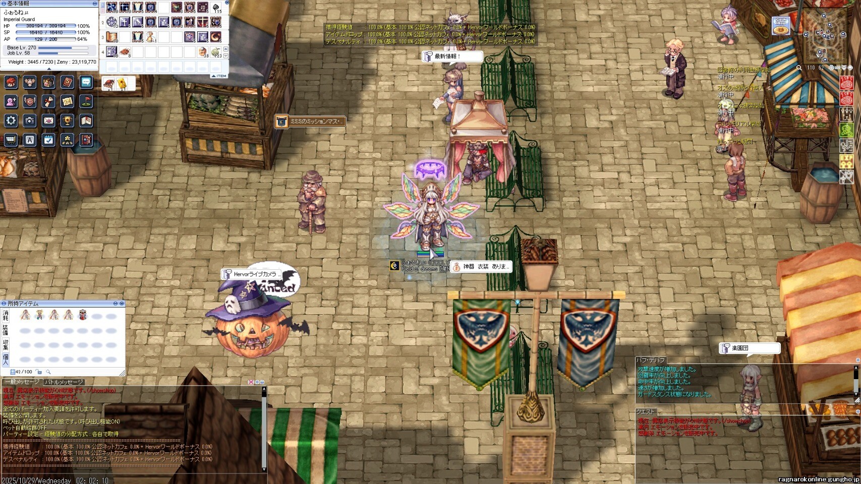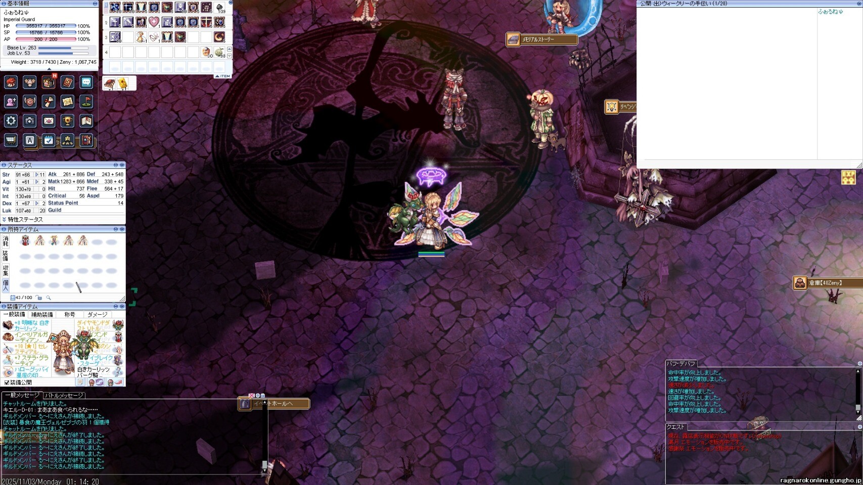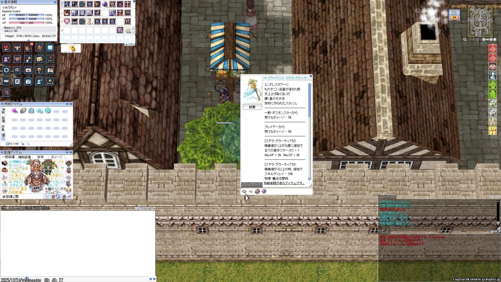 ブブ羽と神器。ブブ羽に一目ぼれして、かっきーん。なぜか神器が格安で売っていたので購入。もう最前線では使えないけど、Gvギルド運営者のあこがれだったので満足(笑)