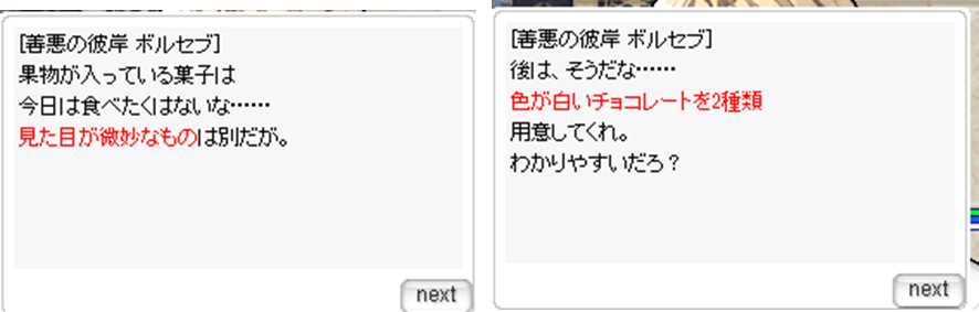 おもてなし情報まとめている方いるのかな?ボルゼブ初日分。ヒントのひねくれ具合がこー。・ホワイトチョコ・手作りホワイトチョコ・微妙な形のストロベリーチョコ
