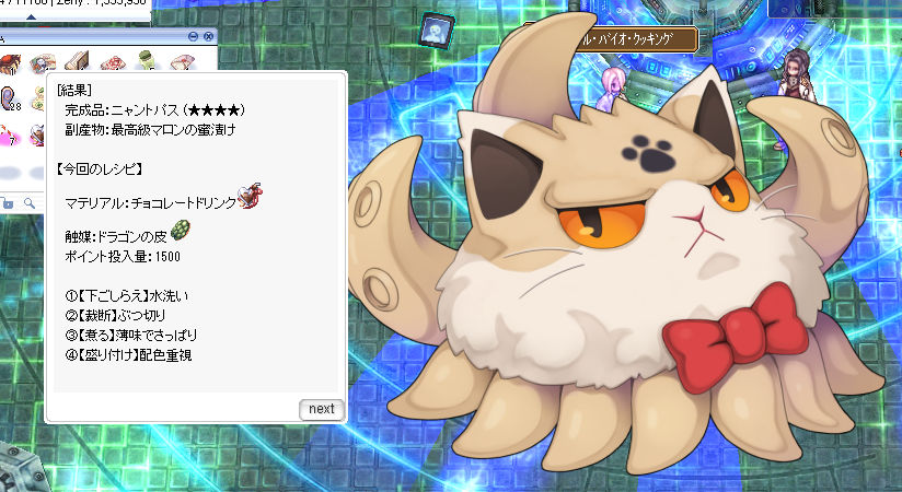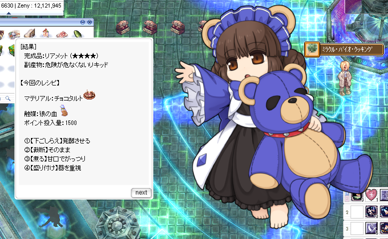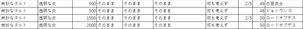 ミラクルバイオ。あくまで1つの傾向として:「2000ptでできるパターン」と「それのコストだけを500ptに下げるパターン」とで、登録Noが1or2つずれたモノがでるパターンがちょくちょく見える。なんとなく、マテリアル・触媒・調理方法によってツリーが決まって、その深さというか高さというかがポイントで変わるような印象を受けるなあ。あくまで想像だけど。