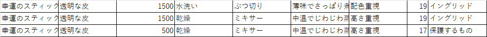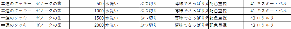 さらに別パターン。こちらは「同じ素材」で「調理方法だけ変える」パターンと「ポイントだけを変える」パターンとの比較。組み合わせが多すぎるので判断するのは早計だと思うけど、調理方法の影響度は小さいかも?