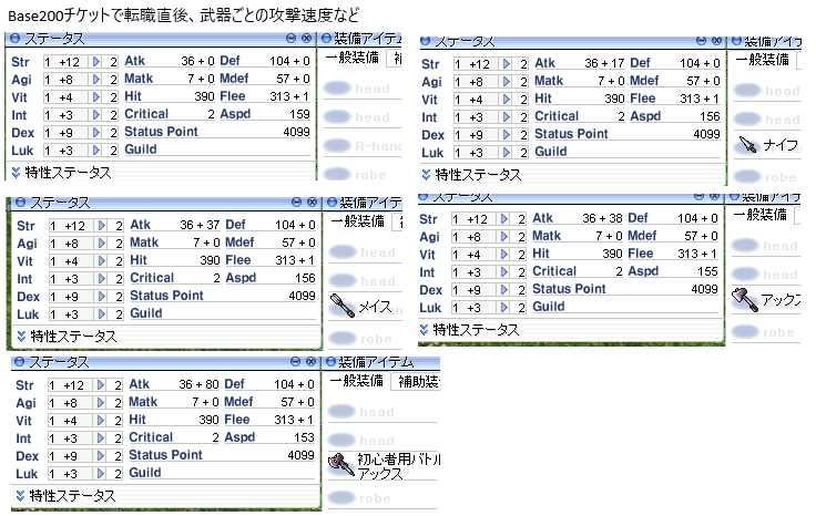 Base200チケットでアリテアになった直後での、武器ごとのASPD