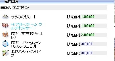 衣装太陽神など露店してます。別枠で交換募集中です。出)+10グルーム指し覚醒信奉者求)+9リュカンよろしくお願いします。