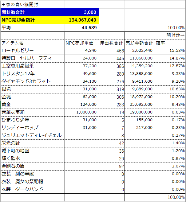 豪華な宝箱の出が悪すぎる。大抵1%前後になるのに結果は0.63%。開けてる途中0.3%台が続いてたから今回低いとは思ってたが・・・。