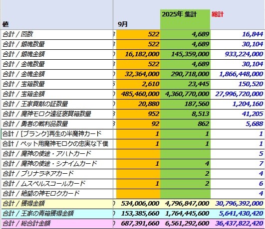 貢献の証を王家の箱と交換して、出たアイテムの売却額も計算。6,000個開けて296.1Mz