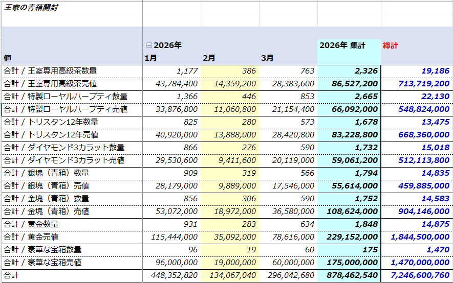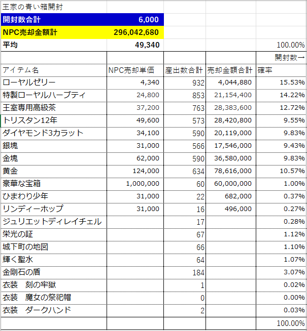 貢献の証を王家の箱と交換して、出たアイテムの売却額も計算。6,000個開けて296Mz