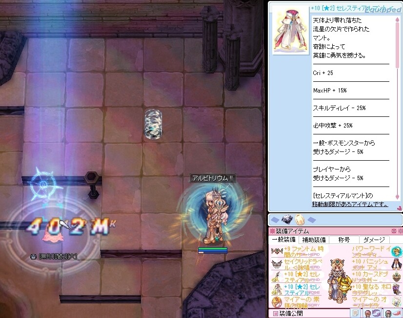 究極精錬前の運試しも兼ねて、4次職スターターキットの武器を超越+10にしたので、アクセと合わせて与ダメ比較をしてみました。武器の方は未超越+9浄化武器(深海のデビアスC挿し)とほぼ互角。アクセは流石にカード未挿しと云う事もあって、崇拝の指輪(マイアーC挿し、EX-INT、INT+7、MP+15%)には勝てませんでした。多分、同じカードを挿したとしても崇拝の指輪にはEX-INTの恩恵がある分、セレスティアルリングではそこまで火力は出ない事が分かりました。数年前の職アクセですが、エンチャ次第で4次職アクセを上回る能力を持つ事に賞賛を送りたいですね。