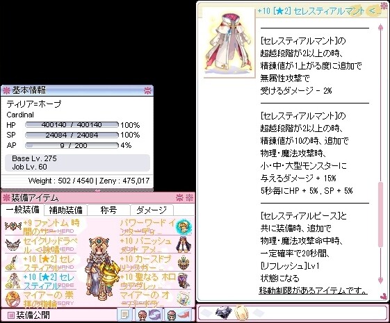武器を叩くのに使ったメダルが余っていたので、ユンケア戦を想定して聖耐性用肩も超越2にしました。手持ちのメダルで運良く+10になったので、超越+10と超越2+10での与ダメ比較です。大体、10%程の火力向上が確認できたのと、MHPもついに400kに到達しました。作るのは大変ですが、実際作ってみるとセレスティアルマントは中々優秀でした。火力耐久共に増えたのはかなり助かります。これで火力耐性共にUPしたのでユンケア組手が今まで以上に安定しそうですね。