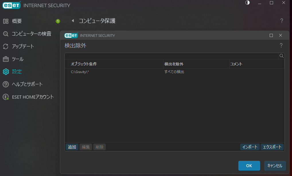 設定>コンピュータ保護>除外の編集>フォルダ指定>C:\Gravity\Ragnarok>OK
