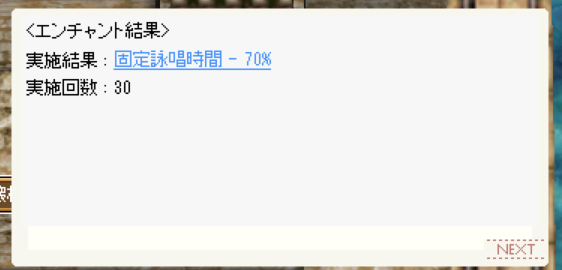 G狩りのファロスハードの後にインターに石化エンチャチャレンジをしようとしたらうっかりオーリーオラにエンチャをして固定詠唱--70%が消えて大慌て。ギルドの子からエンチャ材料を借りたりN鯖から買い集めたりして都合59回目でようやく元に戻ってほっと一安心。今度からは横着しないでエンチャ対象の装備以外は脱いでからしよう・・・。