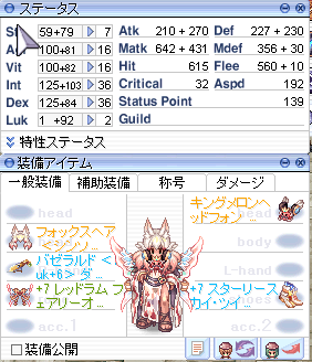 基礎ステ(1)パパホン(シンソウ+10)狐ヘア(シンソウ+10)マランエンチャ武器(+12)フェデン(+10)スターリー(+15)アニババフ)(+30)JOB補正(+5)これで93。あとは適当なアクセに安らぎを奪われしものカード(+5)と魔神の幸運2(+2)をさせばギリLUK100達成。