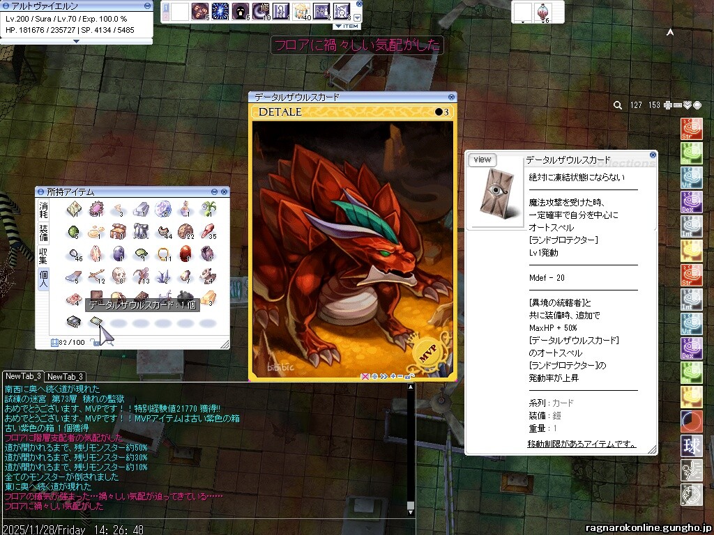 おもいっきりSS取り損ねてたのでフロア違いますが、夢幻試練でデータルザウルスカードがでやした! ありがとうRO!