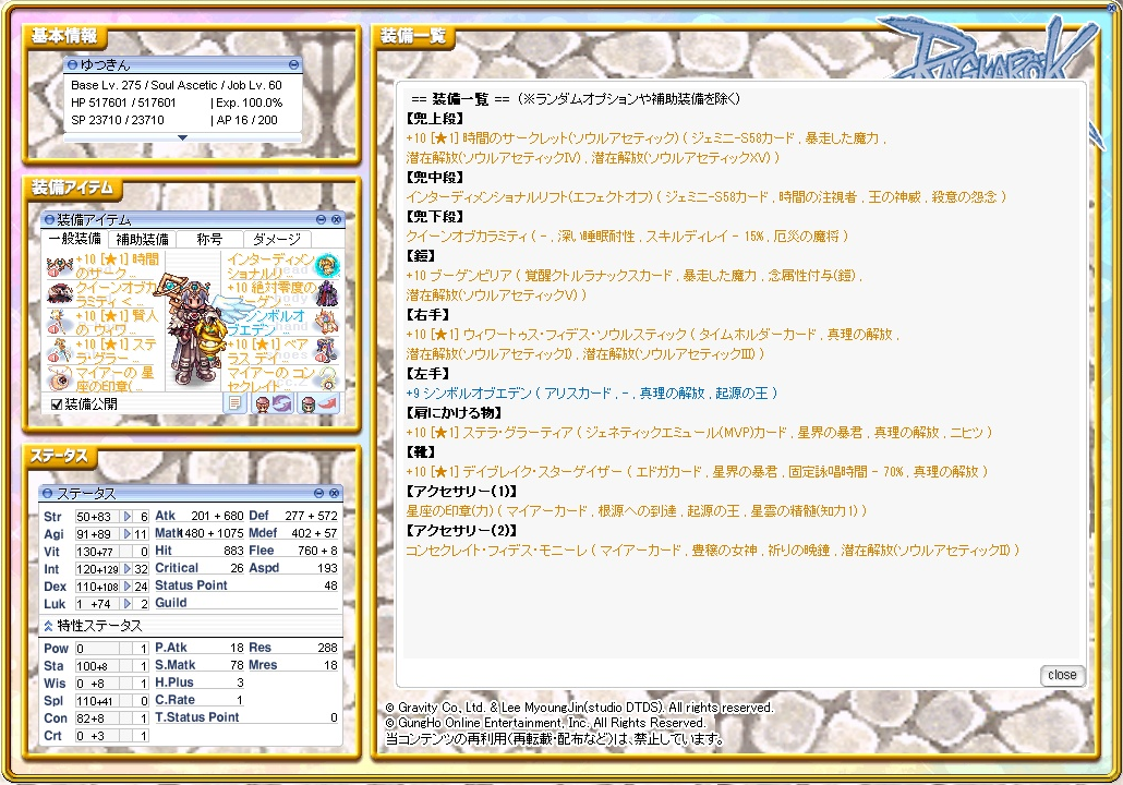 2026究極後の装備です。四方神符でもカンスト近く出るのでソウルアセティックは大分楽しいです。