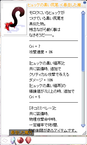 しかし売ってた人はなぜ尻尾に暴魔を付けたんだろう。とにかく私はコイツでInt+40ディレイカット30だ!