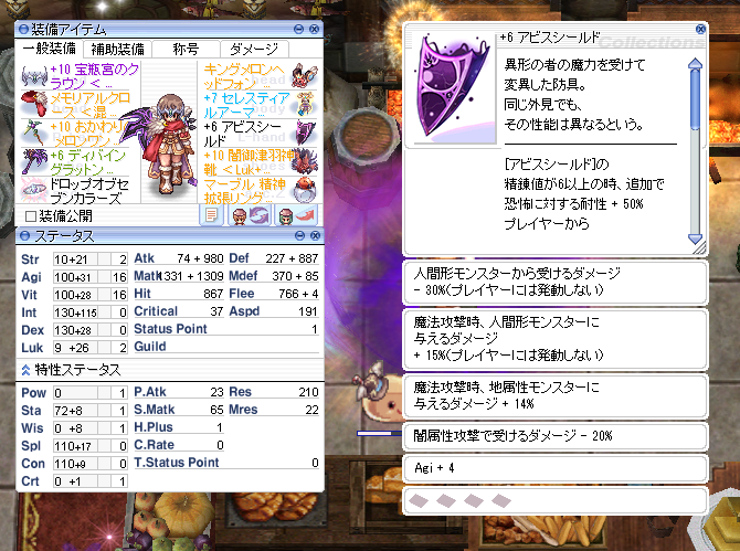 一応、ガーリン頑張ってた装備を公開。もうちょっと合っているOPの盾があれば死に戻る回数を抑えられると思います。