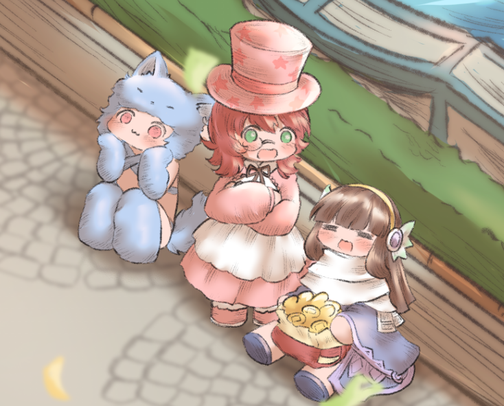 @kalen_manbou うわ癒しパワーすごいバルムントにポップコーン渡してる猫ちゃん、めじぇ様、そして噴水の角でコソコソしてる猫ちゃんっ