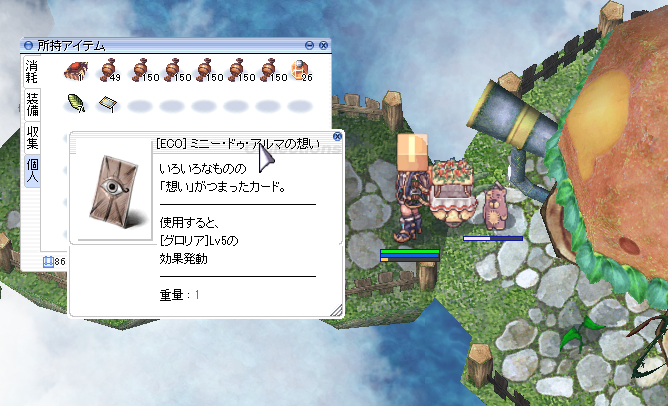 私「ポムポム草の採取完了っと。 自爆(試作型ワープボタン)で戻ろー ・・!?カード???」 「おじゃましてます」私「?!あ、消耗品枠か。でもなんで居るの??」