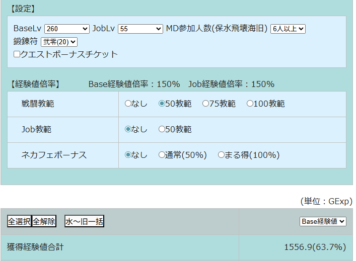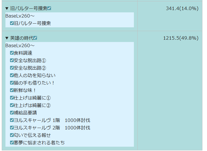 土曜に水~海とYEマト20鍛錬符と260デイリーを75教範でLv260で75%増えるよ、ってのが計算できます。日課計画のお供にどうぞ。
