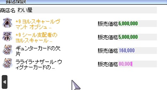 +7セトの恩寵と覇王/殺意のパラダイスロストを追加で並べました。ステ次第で必中が稼げる詠唱妨害隷属や+7スピクロもあります。B鯖南十字付近に御用の際は是非「兎小屋」156,119付近までよろしくお願いしますm(_ _)mN鯖でも+10モカダスデスト売ってます。是非m(_ _)m