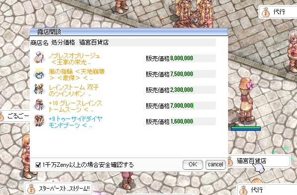 ラグホの民なので値段下がるのも嫌だしN鯖で通常露店したらすぐ売れた休止気味なので特に欲しい物無いけど+10龍槍に買い替えてもいいかもしれんけど覇王付きは出物無さそうやな
