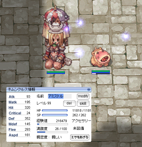 最近は負荷の関係もあってじっとしていることが多いので、サブジェネのホムンクルス好感度上げが順調に進んでいます。2回ほど満腹度9にしてしまい、赤くなる前にエサやり1回やってしまっているので、最短とまではいきませんが悪くないペースですね。残り160エサ27時間くらいでしょうか。