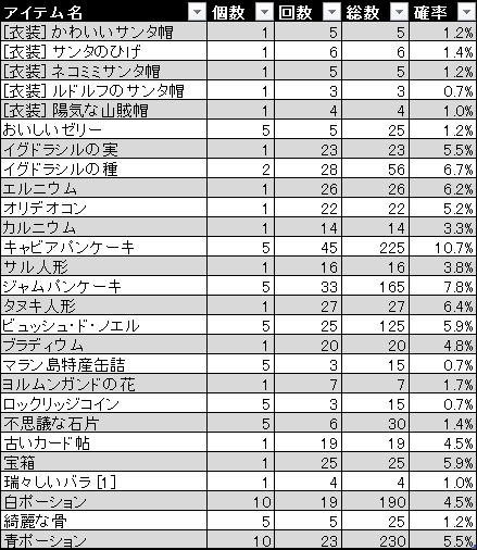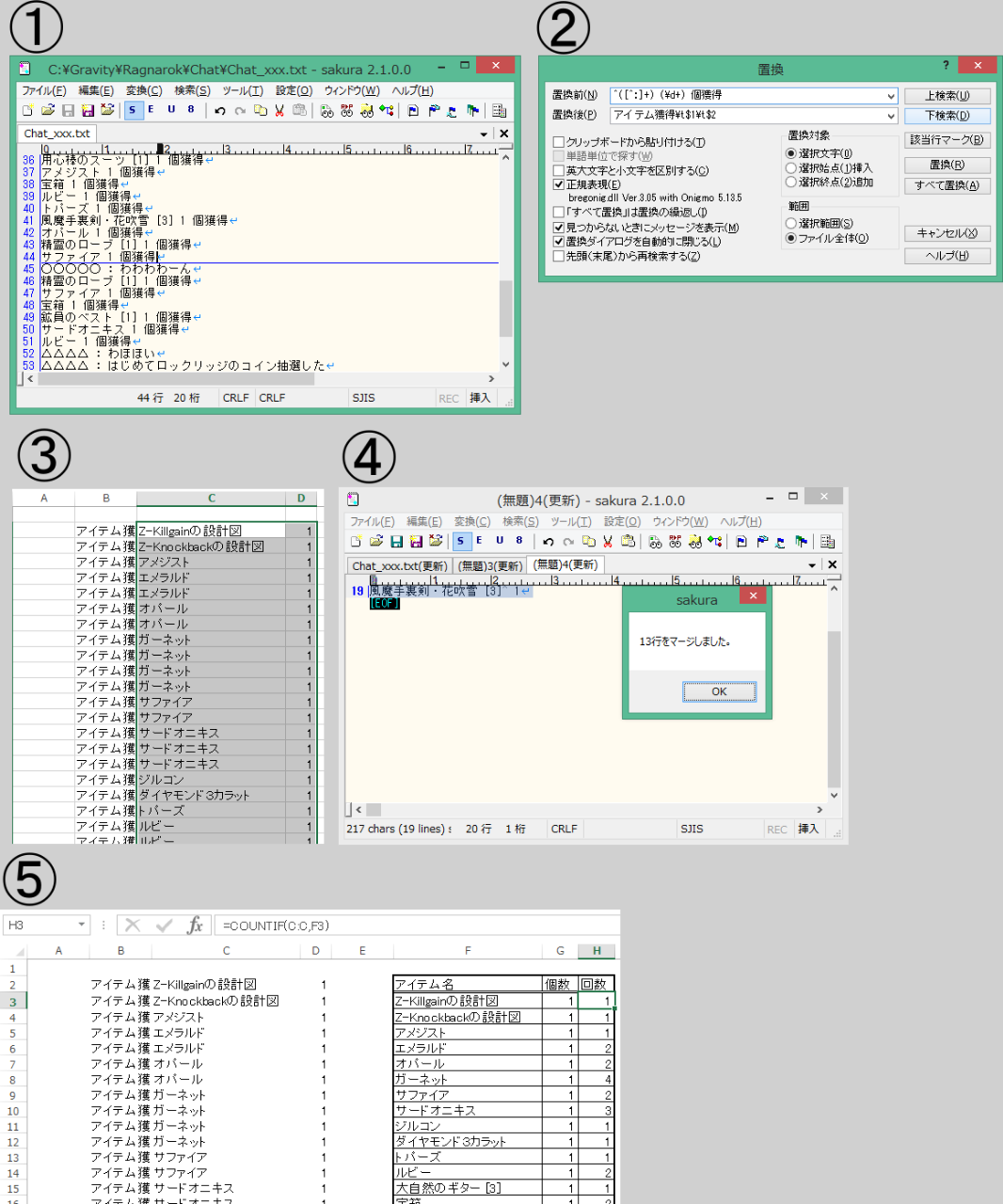 ③「アイテム獲得」で始まる行をExcelに貼り、アイテム名と個数の部分をコピーしてエディタに貼り直し