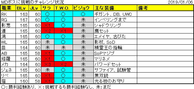 クリアしたことないキャラでMDボスに挑戦2019/01/06の状況