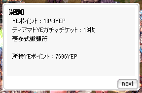 イベントMDの待ち時間+消化時間でティアマトYE遅刻するかもという感じでしたが、丁度予約が取り消されたので遅刻なくいけそうです。