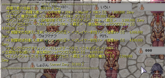 お久しぶりです。おはようございます~。今日も今日とて宣伝失礼します。N鯖プロンテラ市場194.142にて「+9イリュージョン死の引導者」を890M(N鯖890k)で売り出しております。宜しければ買って下さいませ~。