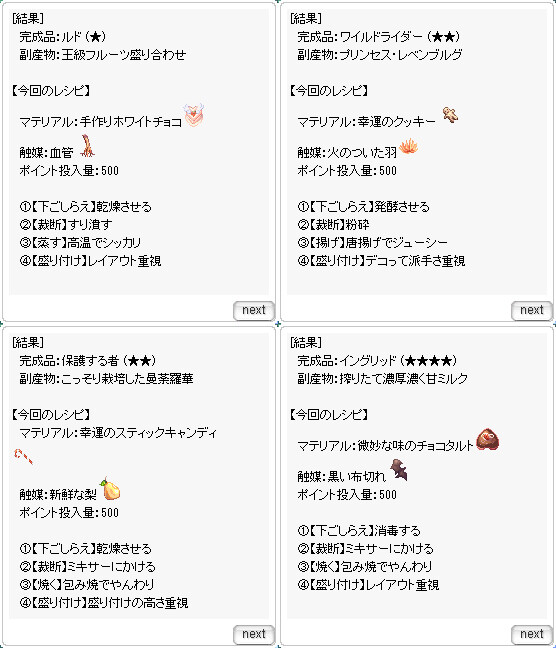 ミラクルバイオクッキングは補助用人工精霊が5種類いて切り替わる毎に実験結果にも多少の影響を与えるとかヴェルナーが言っていた。