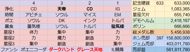 報酬箱:あまり適応職無しファンシー:2勝2敗オク:デモヘルムと衣装落札マーチ:260/55を4キャラ回廊:アニバ優先でモチベが鯖マト1アカ目極限HP15D102アカ目極限HP15V103アカ目一応一個シンソウ確保