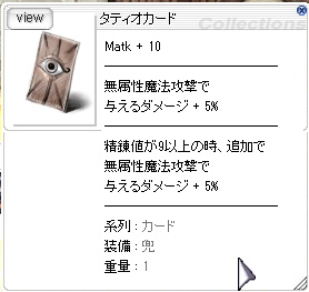 タティオc。とりあえず確保したけど、これ適当な旧王家c(BaseLvが2上がる度に追加でAtk + 1 , Matk + 1)より弱いなんてオチないよね・・・。