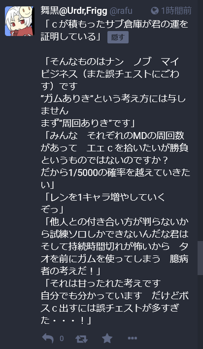 この鯖での魔神殿周回2466回目で初のcドロップ、1度の魔神殿でc獲得チャンスは5回つまり12,330体でcを1枚獲得と考えたらまぁ普通・・・だな!