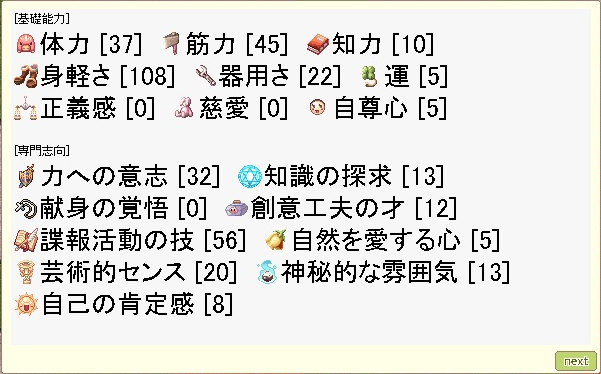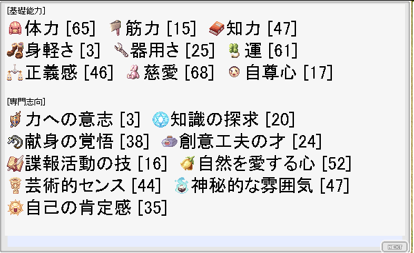 闇落ちしたステータスだけみて見ると脳筋にしか見えないけども・・・諜報、創意工夫あたりもあるからそうとも言い切れないなぁ・・・