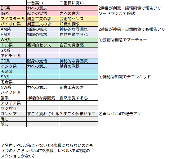 @tunasand 朧もニュトさんの方に報告あったみたいです。今のところ、転職条件がその職業のイメージにマッチしている気はします。