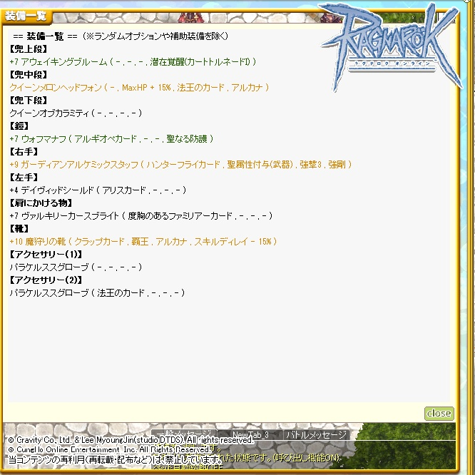 散々悩みましたが、ロードオブロイヤルズ(詠唱不可・アレス・王の神威)にしました!思ってたよりHP伸びた…w次の目標は当初の通り、+7シナモンかなー。またお金貯めなきゃ。