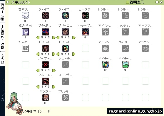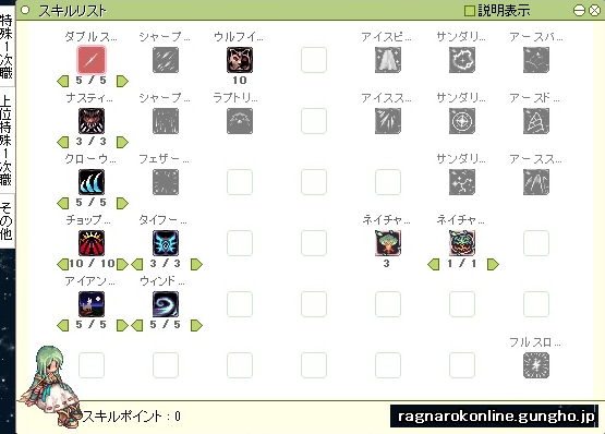 ・基本狼くんでチョップ使いながら飛び込んだり一瞬世界樹になってSP/ハンガーでHP回復したり・鳥さんは移動+α バフスキルとか一応取ってるので、MD道中の敵を倒す位ならタイフーンLv3でも余裕・反射対策を考えると、鳥さんスキルをパッシブ含め取っていく感じになるかなぁ・アリテアになったらどうなるか分からないけど、狼くんメインサブ鳥さんになると思う・今のとこステは100/60/90/50/100/1 今後はどうしたものか…