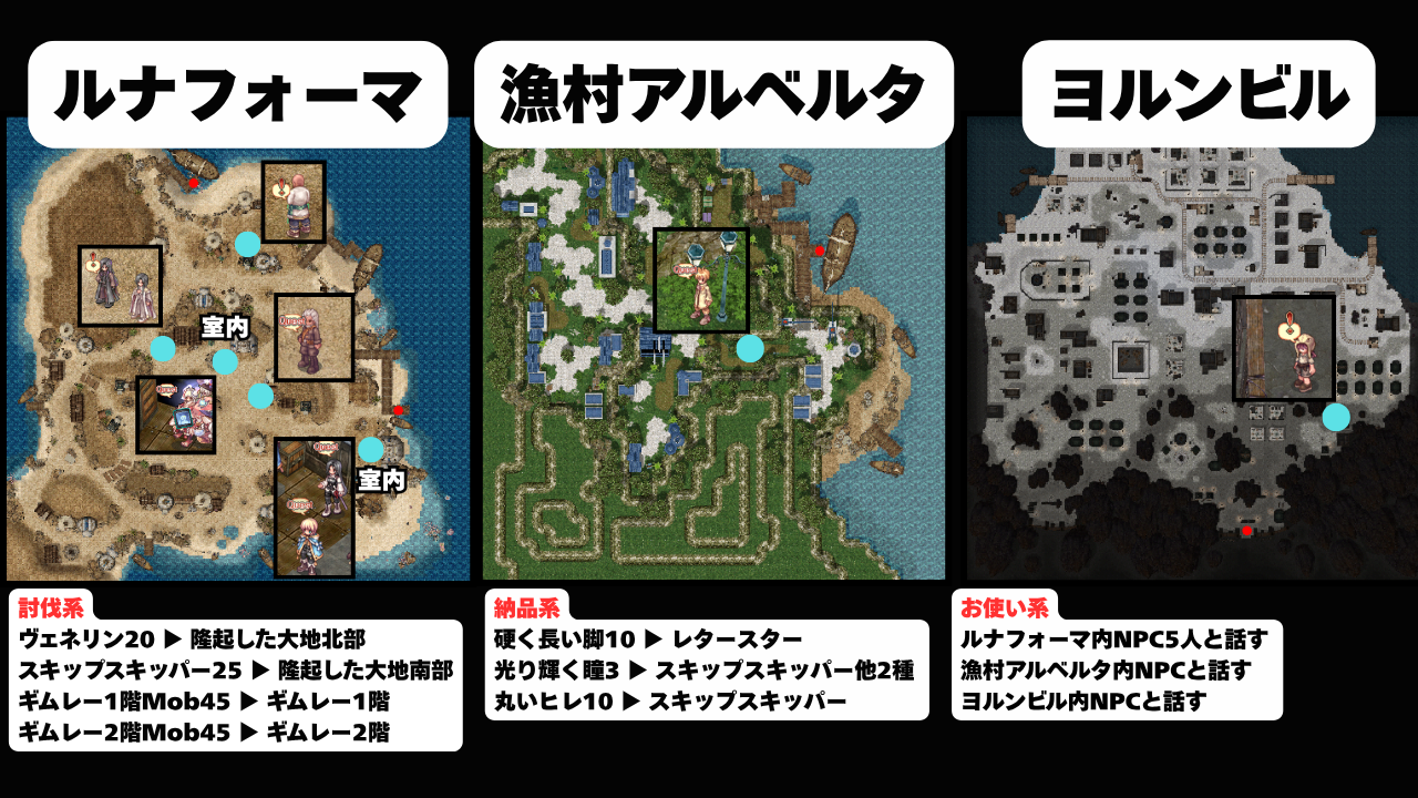 今更ですが、希望している方が見えたので、イスガルドデイリー身内用メモです。よろしければ参考にして下さい。 :ro_butasan: