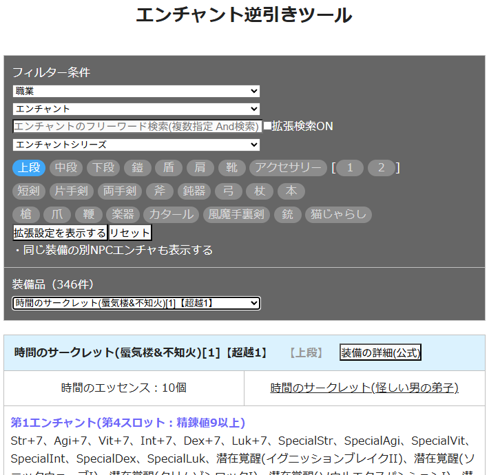 エンチャント逆引きツールに1月ラグ缶装備と時間&暴食の超越1に対応しました。究極投資計画のお供にどうぞ!https://kousakamil.fc2.net/blog-entry-148.html